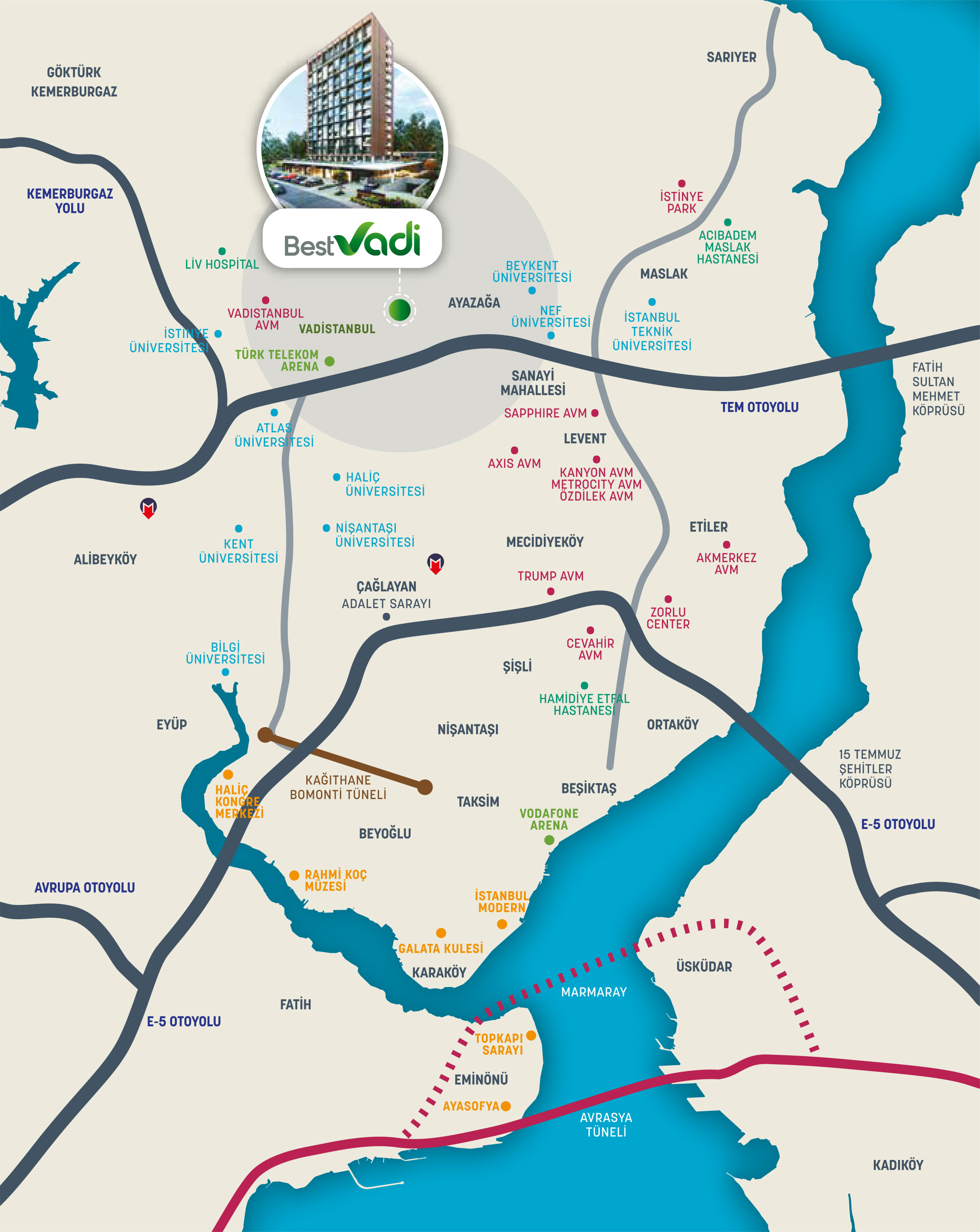 Best Vadi’den özel aracınızla TEM otoyoluna saniyeler içerisinde bağlanabiliyor, iş dünyasının merkezi Maslak’a 3, FSM Köprüsü’ne ise 5 dakikada ulaşabiliyorsunuz. Taksim’den Pendik’e, Mahmutbey’den Mecidiyeköy’e; tüm metro ağına bağlanan Havaray ise 2 dakikalık mesafede. Çok daha uzaklara gitmek istediniz diyelim; İstanbul Havalimanı ise 20 dakika uzağınızda.